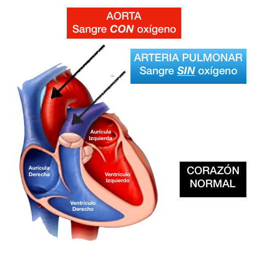 La sangre sin oxígeno (azul) llega a la aurícula derecha (AD) a través de las venas cavas una superior (VCS) y otra inferior (VCI); de la aurícula derecha pasa al ventrículo derecho (VD) a través de la válvula tricúspide. El ventrículo derecho se contrae, se cierre la válvula Tricúspide y envía la sangre a la arteria pulmonar (AP) a través de otra válvula (la pulmonar) que evita que la sangre retroceda hacia el ventrículo. La arteria pulmonar se divide en dos arterias, una para el pulmón derecho (APD) y otra para el izquierdo (API) (en el esquema superior animado de la circulación normal, sólo se presenta una arteria pulmonar). En los pulmones se oxigena la sangre y regresa ya oxigenada (roja) a la aurícula izquierda (AI) a través de las venas pulmonares derechas (VPD) e izquierdas (VPI). De la aurícula izquierda pasa al ventrículo izquierdo (VI) a través de la válvula mitral, y del ventrículo izquierdo a la aorta (Ao) a través de otra válvula (aórtica). De la aorta nacen innumerables ramas que llevan la sangre a todos los órganos y tejidos. Las primeras de estas ramas son las arterias coronarias, que llevan sangre oxigenada (roja) al propio corazón, al músculo cardiaco o miocardio, de la que extrae el oxígeno necesario para seguir latiendo. Los demás órganos también extraen el oxígeno. La sangre ya sin oxígeno (azul) regresa al corazón, a la aurícula derecha, a través de las venas cavas (VCS y VCI), iniciando nuevamente el ciclo.